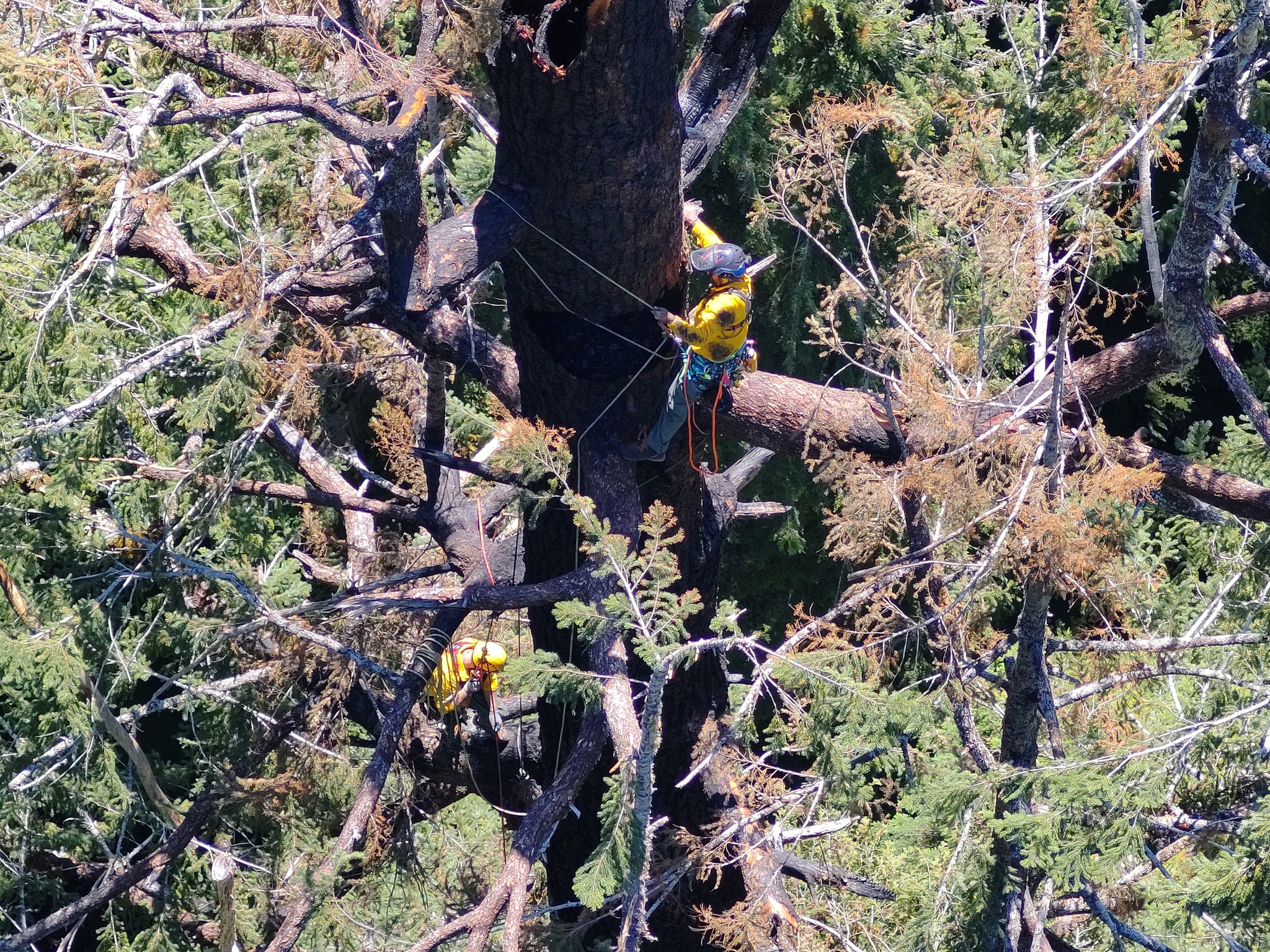 The team of tree climbers successfully scaled the 300-foot tree and sprayed water directly into the burning area. Thanks to their efforts, the tree remains alive, although it lost about 50 feet of height from the fire.